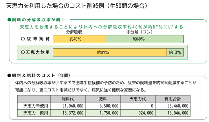 実際に天恵力を使用した酪農家では、50頭の搾乳牛で年間700万円の飼料代が、200万円減り、約30%のコスト削減が実現しました。